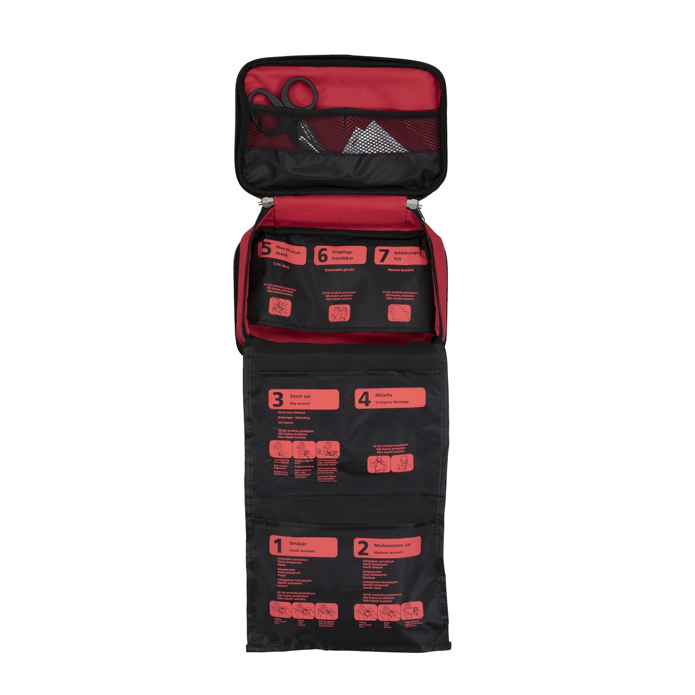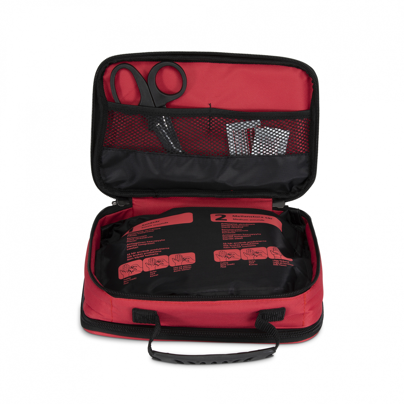 En komplett första hjälpen-väska som är bra att ha när skadan är framme. Väskan innehåller delar och för att hantera allt från små till lite större sår, tryckförband och gel för mindre brännsår.