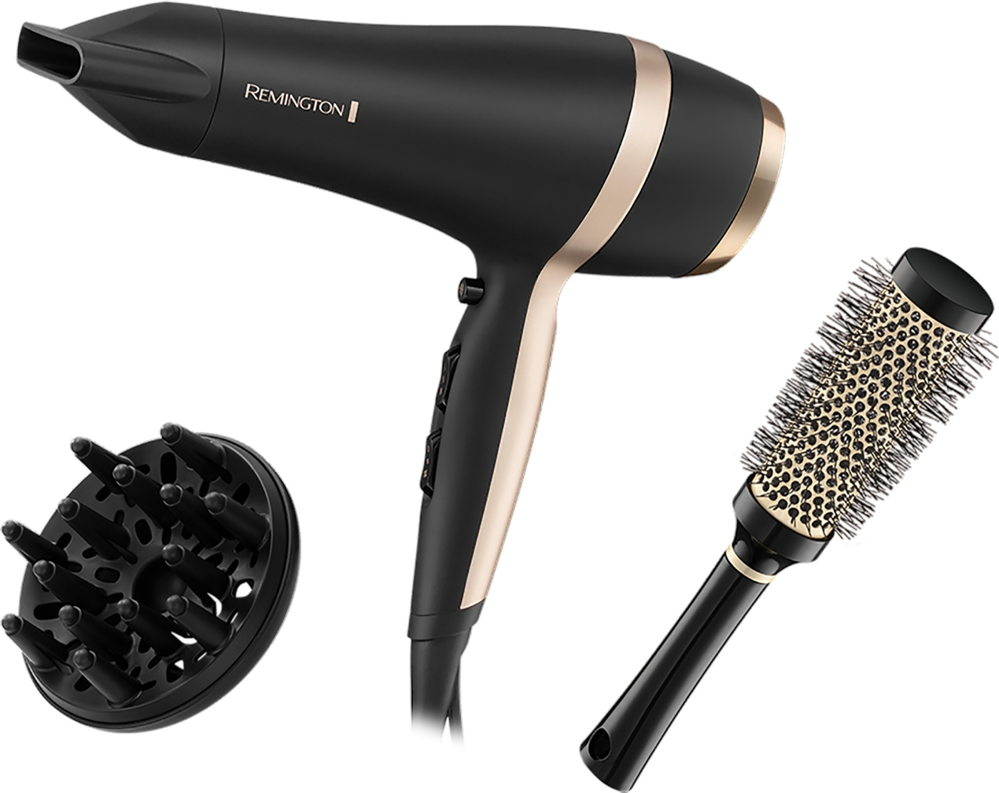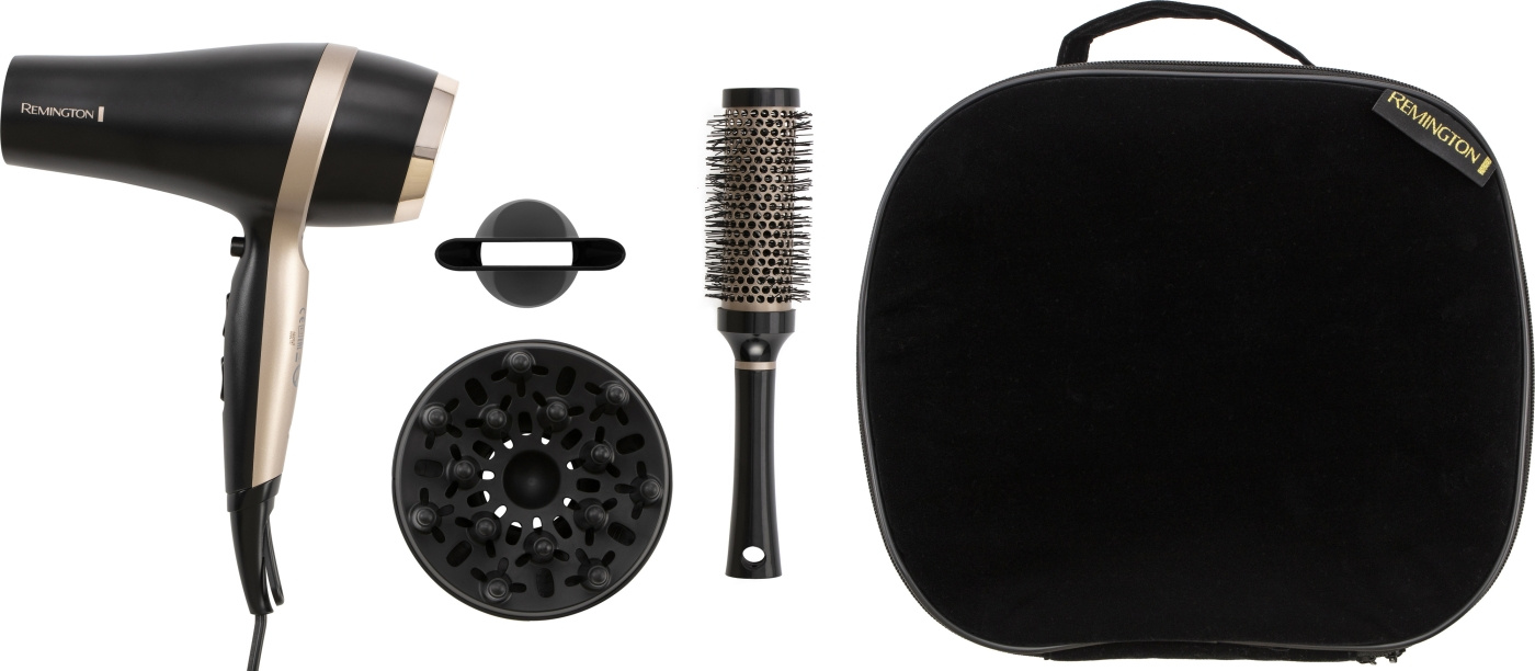 Ingår i den underbara presentförpackningen: lyxig förvaringspåse, rund borste för att föna hår, munstycke för fön och diffusor