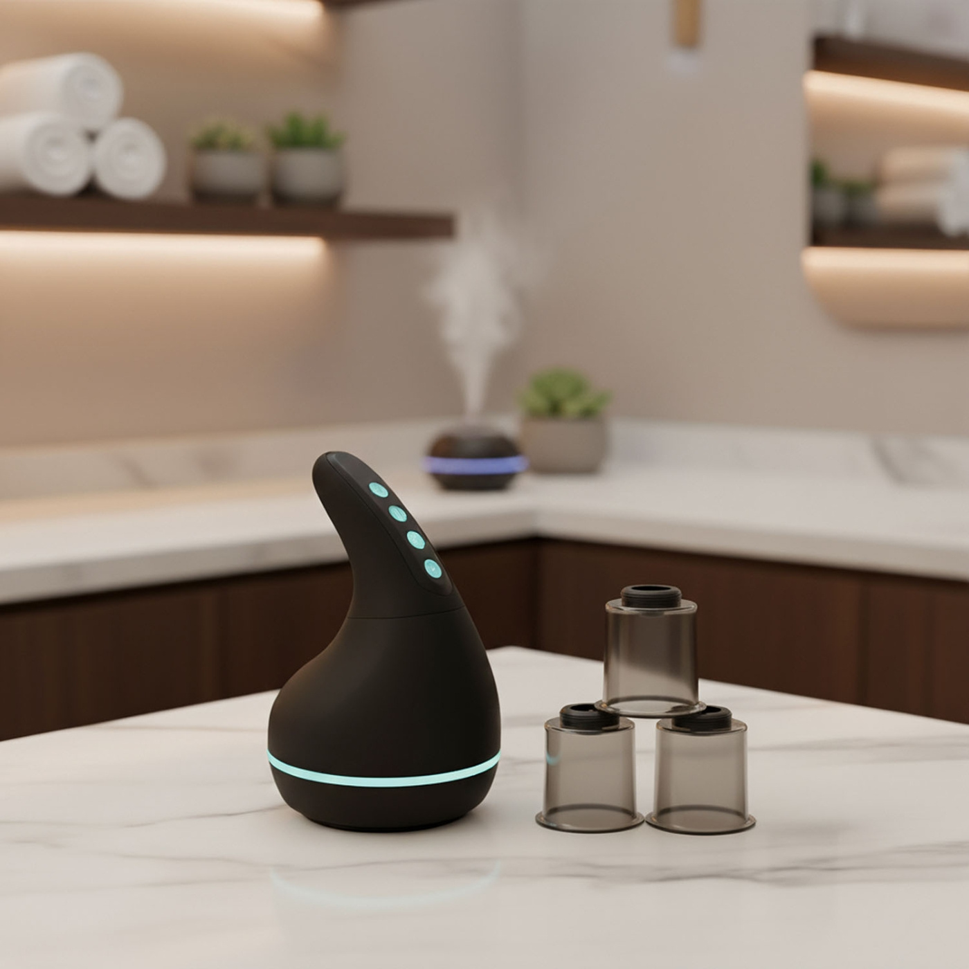 Enheten drivs av ett 1800 mAh-batteri som ger upp till 120 minuters sladdlÖs drift, vilket gÖr den bekvÄm att anvÄnda hemma, pÅ en salong eller efter ett trÄningspass. Den lÄtta och hÅllbara ABS-konstruktionen, tillsammans med en tydlig display, sÄkerstÄller anvÄndarvÄnlighet. Setet innehÅller sex utbytbara koppar i olika storlekar, en USB-C-kabel, instruktioner och ett garantikort.