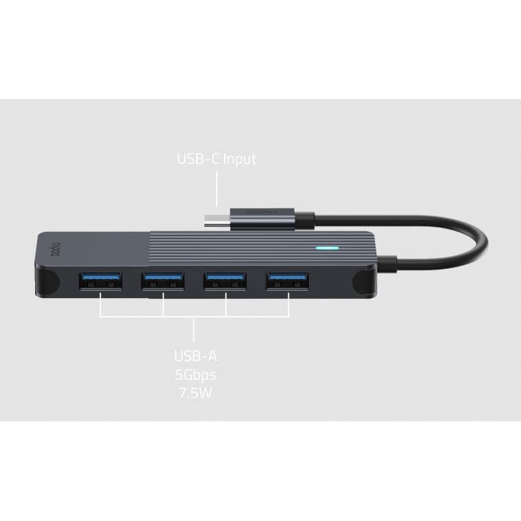 RAPOO UCH-4001 USB-C till USB-A Hubb. Enkel Plug & Play, inga inställningar/drivrutiner behövs. Snabb och pålitlig filöverföringshastighet (5 Gbps).