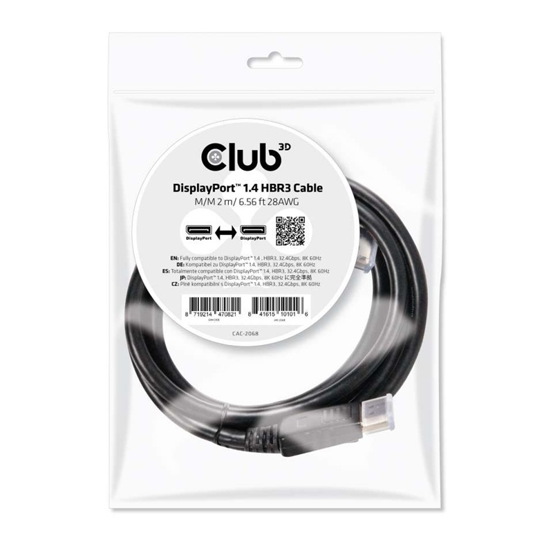 CLUB3D DisplayPort 1.4 HBR3 Cable 2m/6.56ft M/M 8K60Hz