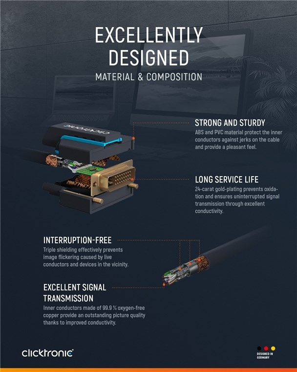 - Zuiver koperen geleiders en 2-voudige afscherming voor haarscherpe video- en beeldkwaliteit
