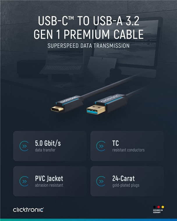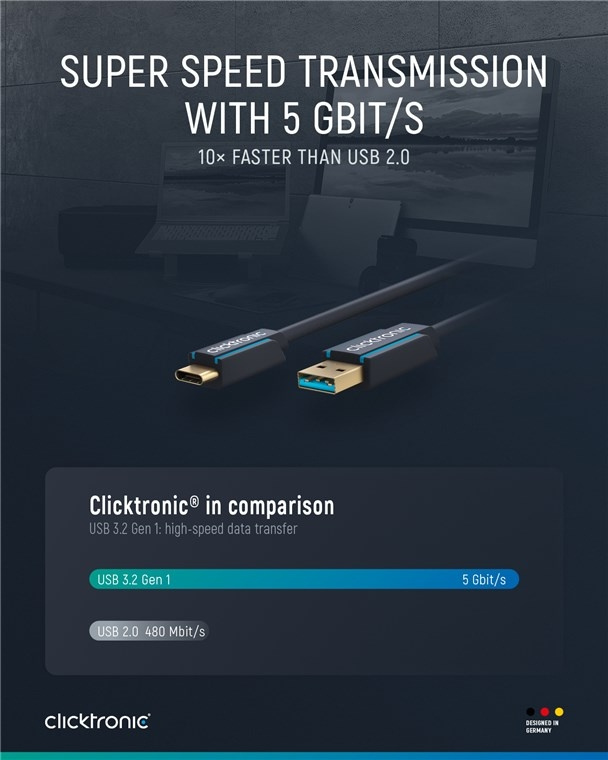 - USB-C™ kabel 3.2 Gen 1 met SuperSpeed gegevensoverdrachtsnelheid tot 5 Gbit/s is 10x sneller dan USB 2.0.