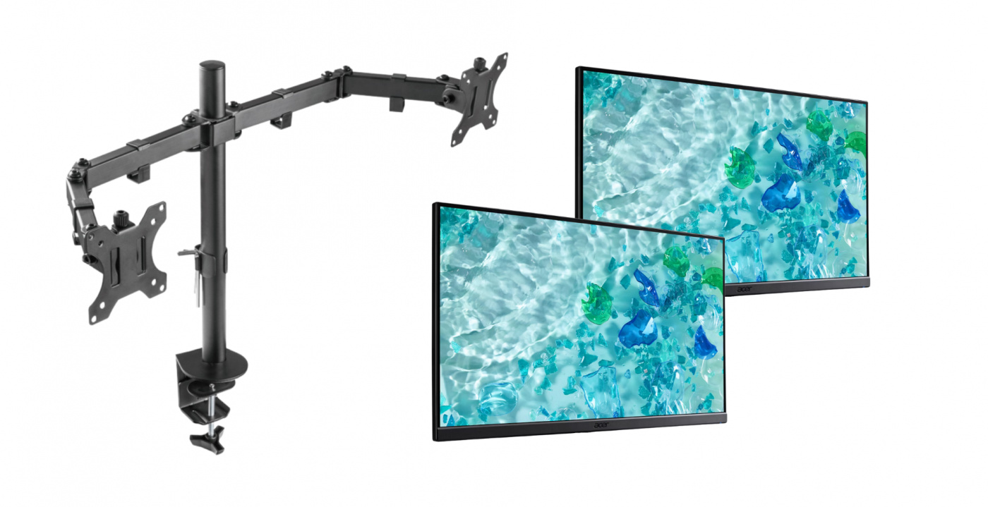 Dit is een compleet pakket met een Deltaco Gaming GAM-040 monitorbeugel en twee Acer V247Y-monitoren.