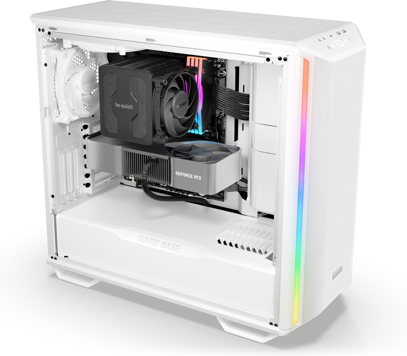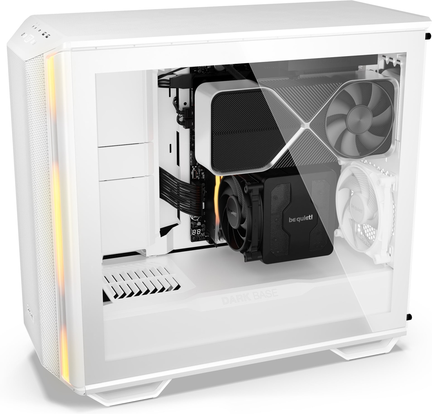 Het ontwerp van de Dark Base 701-behuizing garandeert uitstekende bruikbaarheid en gebruiksgemak. De open mesh-structuur zorgt voor een hoge luchtstroom en prestaties. Drie vooraf geïnstalleerde Silent Wings 4 140 mm PWM High Speed-ventilatoren zorgen voor maximale koeling en luchtcirculatie.