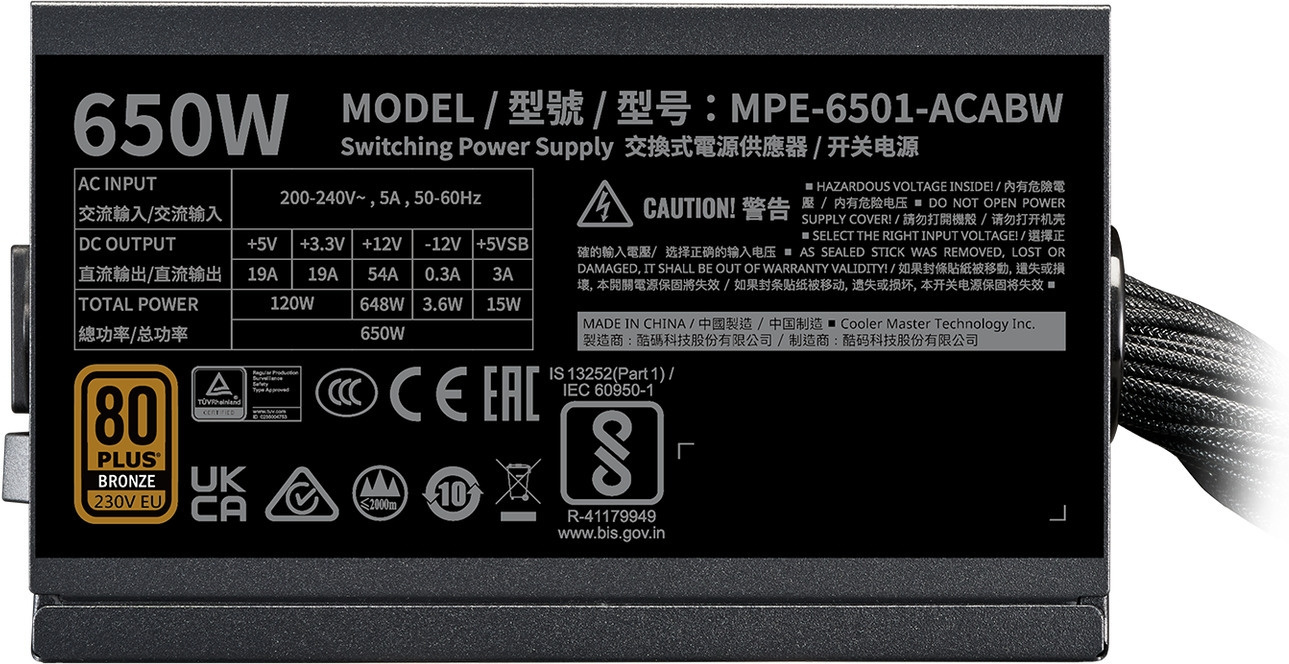 - Vermogen: 650 W (+5V: 20 A, +3,3V: 20 A, +12V: 54 A, -12V: 0,3 A, +5Vsb: 3 A)