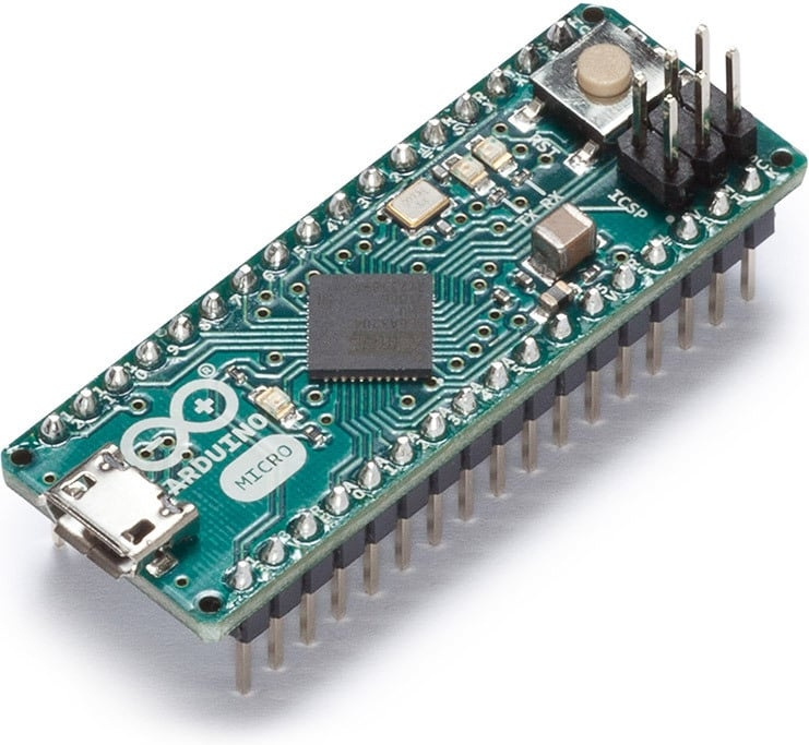 Arduino Micro is een ontwikkelplatform gebaseerd op de ATmega32u4 processor. Het bord heeft 20 digitale in-/uitgangen (waarvan er 7 kunnen worden gebruikt als PWM-uitgangen en 12 als analoge ingangen), een 16 MHz oscillator, een ICSP-header, een resetknop, een microUSB-interface en een voedingsconnector.