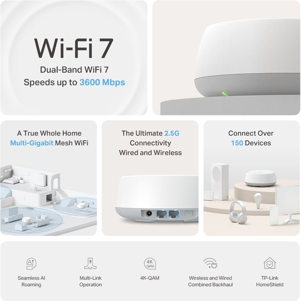 - Inhoud van de verpakking: 3 x Deco BE25 Dual-Band WiFi 7 Mesh-router, 3 x netvoeding, Ethernet-kabel, snelstartgids