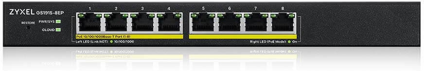 - 8 stuks 10/100/1000 Mbps-poorten, allemaal met PoE+ 802.3at-ondersteuning