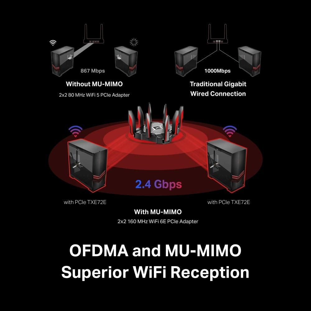 Archer TXE72E brengt de WiFi-ontvangst van je PC naar een hoger niveau met de revolutionaire combinatie van OFDMA en MU-MIMO. Dit garandeert de efficiëntie van de WiFi verbinding van je PC door meer apparaten tegelijkertijd met je router te laten communiceren, in plaats van om de beurt op gegevens te wachten.