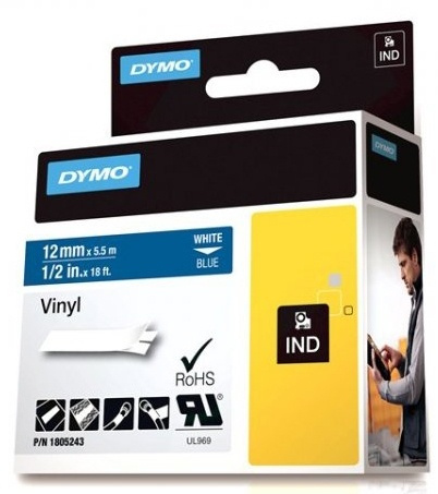DYMO Rhino Professional, 12mm, märkbar vinyltejp, vit text blå tejp,