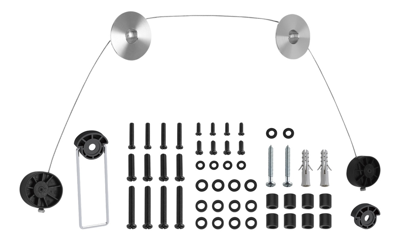 The wall bracket consists of two washers that are screwed onto the wall and 2 washers with steel wire that you attach to the screen you want up on the wall. It also comes with two spacers, one with a longer bracket that allows you to tilt the screen from the wall which facilitates installation of cables to the screen after it has been hung.