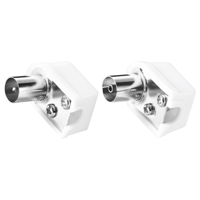 Standard antennkontakt i vinklat utförande som passar utmärkt vid exempelvis trånga utrymmen. Förpackningen innehåller 2 kontakter, 1 hane och 1 hona.