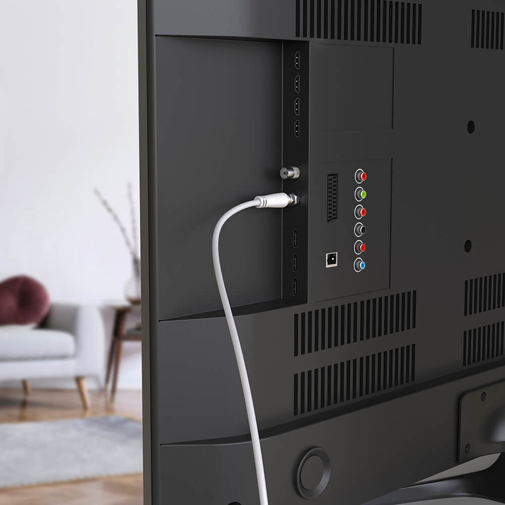 For transmitting audio and video signals e.g. between an antenna socket, satellite receiver and TV. 90-decibel screening rate (dense braiding + extra strong shielding foil) for protection from electromagnetic interference.