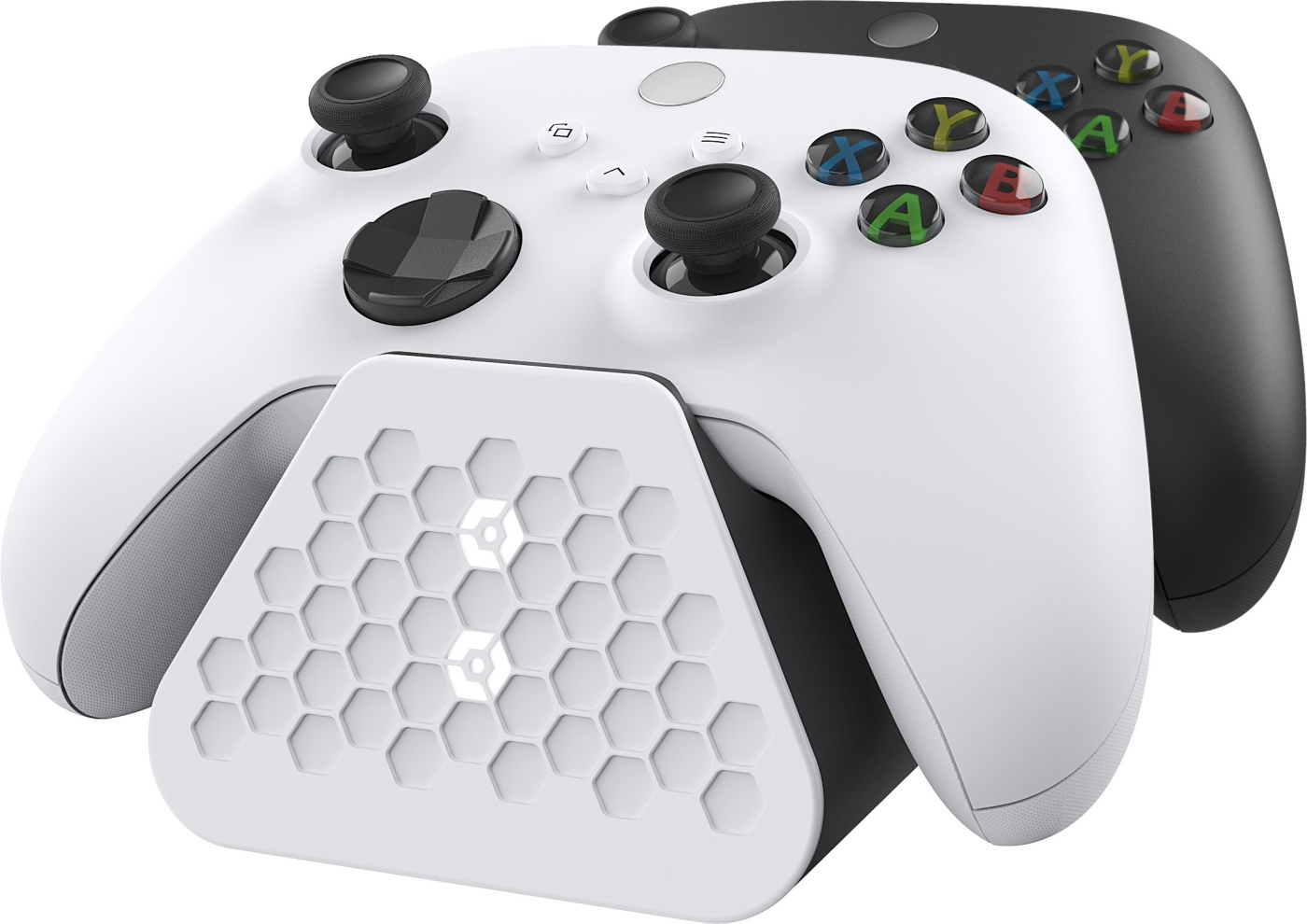 Ladda ner och håll ordning på Xbox-kontroller med Giotecks Duo-nedladdningsdocka. Du kan ladda ner två drivrutiner samtidigt. En svartvit frontpanel ingår. Paketet innehåller två laddningsbara batterier och två svarta och vita bakskal till Xbox Series X|S-kontrollern och två svarta bakskal till Xbox One-kontrollern.