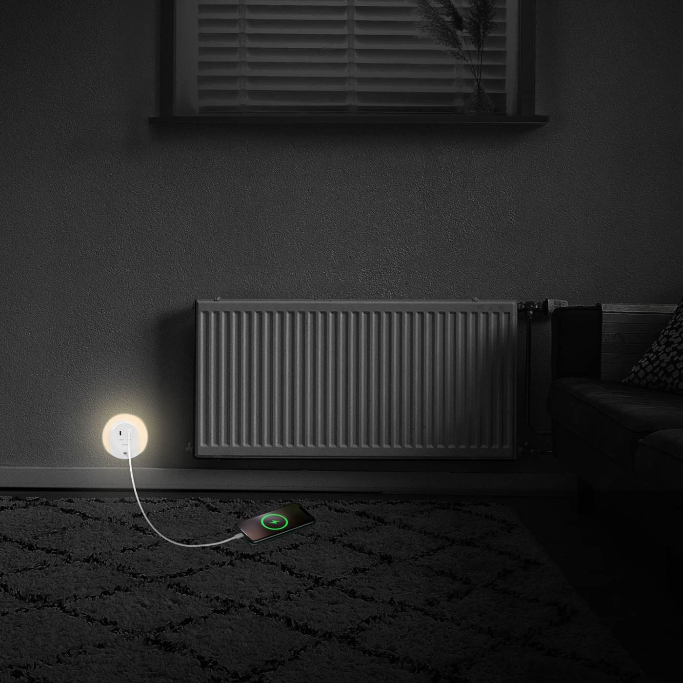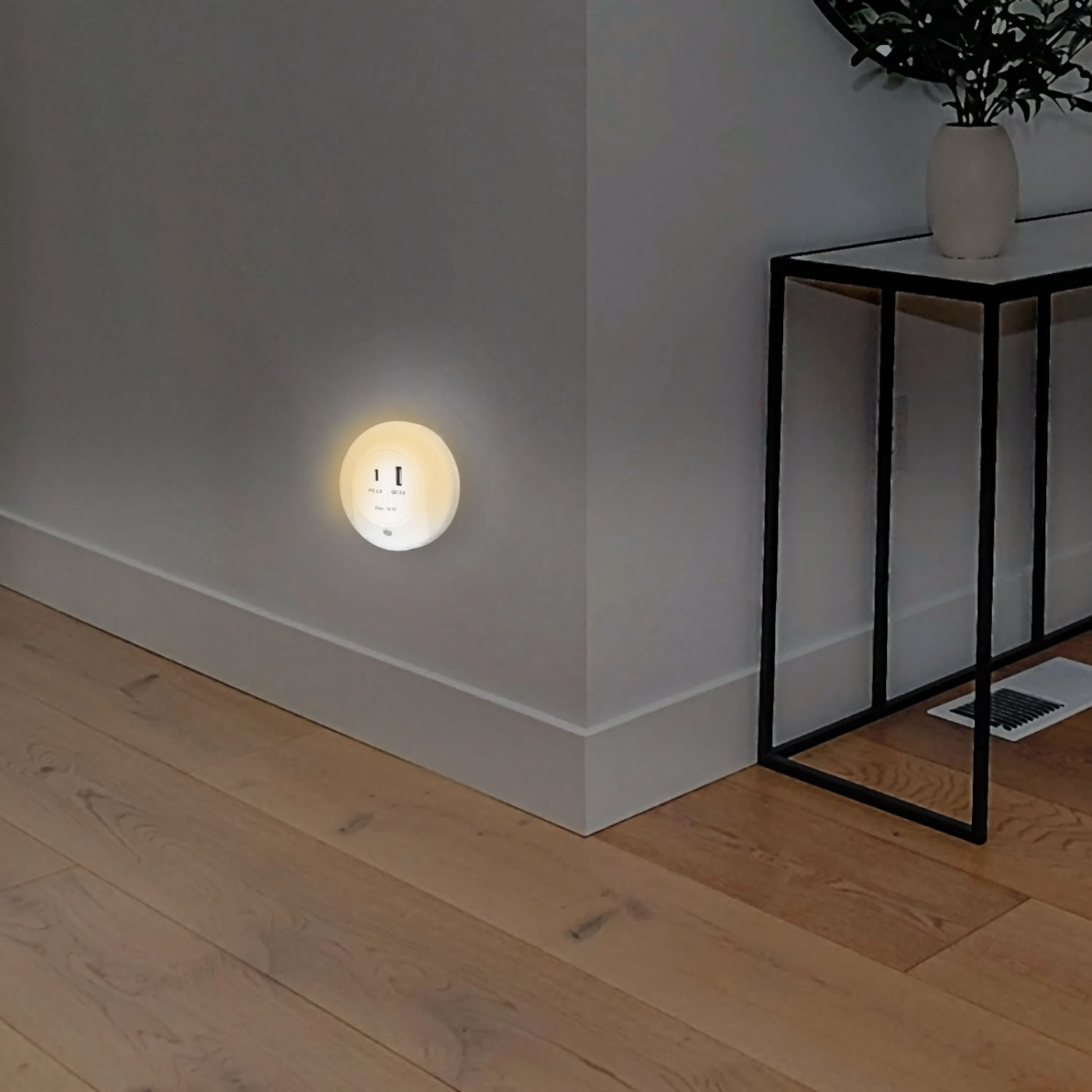 Avger ett behagligt varmvitt ljus och ger orientering i mörkret. Med skymningssensor tänds lampan automatiskt när det blir mörkt, perfekt för sovrum, barnrum, kök, trappor eller mörka hallar.