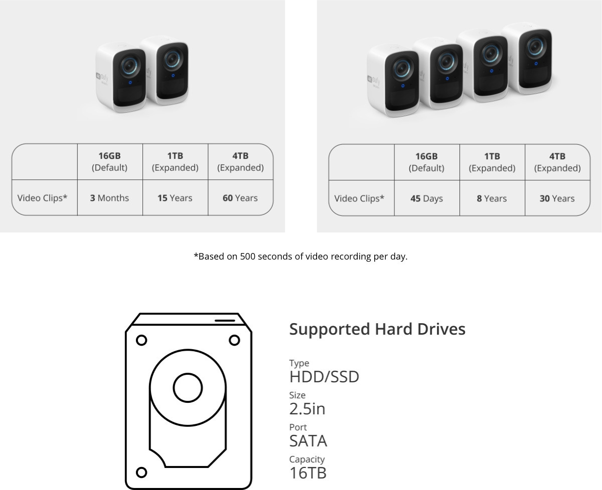 Eufycam 3C gör inspelningar baserade på rörelsedetektering. Den medföljande hemstationen har ett inbyggt 16 GB EMMC-minne för kamerainspelningar. Det interna minnet rymmer cirka 45 dagars inspelningar från fyra 4K eufycam-kameror (totalt max 500 sekunders inspelning per dag). Hemstationen har dock även en 2,5" SATA-anslutning för en separat installerad HDD/SSD-hårddisk (max 16 TB). Det lokala lagringsutrymmet kan därför i bästa fall vara flera terabyte. Alla lokala inspelningar krypteras med 128-bitars AES kryptering. S380-hemstationen kan kopplas ihop totalt 16 kameror och utöver dessa 34 sensorer. Den förnyade hemstationen kan fungera som en gateway för nästan alla eufy- och eufycam-enheter (kräver en uppdatering av hemstationen som kommer att släppas senare.) Så nu kan även de Eufy-enheter som tidigare har fungerat oberoende och sparade i sitt eget inbyggda minne fungera via en hemstation.