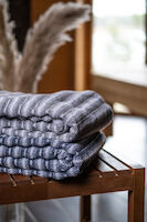 Melangemönstrat badlakan med inspiration från strand och hav med färger som för tankarna till musslor, ostron, sand och maneter. Badlakanet är tillverkat av mjuk bomull och har en bård med fransar.
