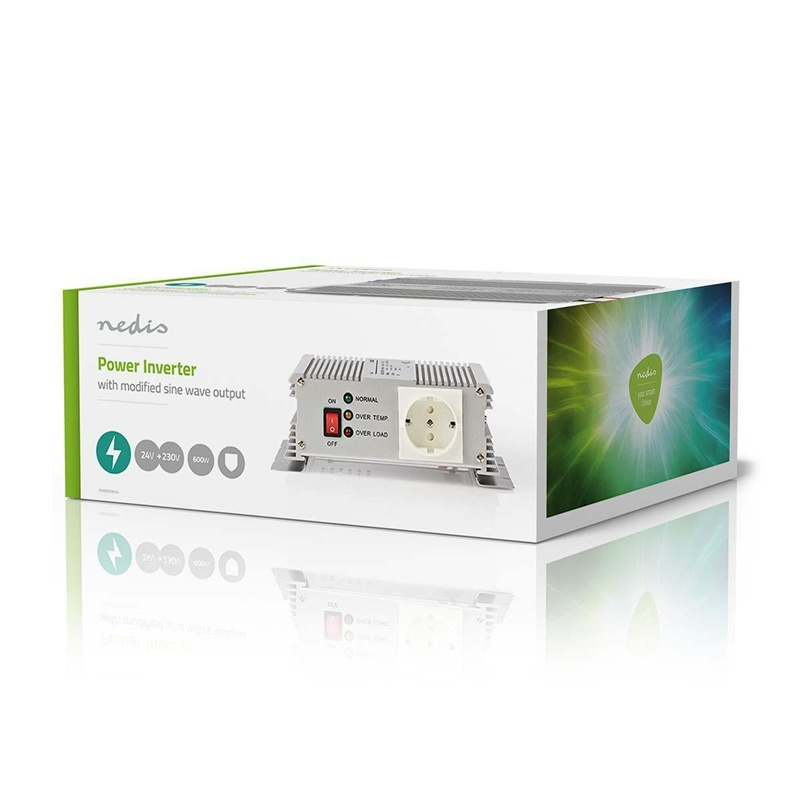 Nedis Inverter Gemodificeerde Sinusgolf | Ingangsvoltage: 24 V DC | Apparaat stroomoutput: Type F (CEE 7/3) | 230 V AC 50 Hz | 600 W | Piekvermogen: 1500 W | Accuklemmen | Zilver