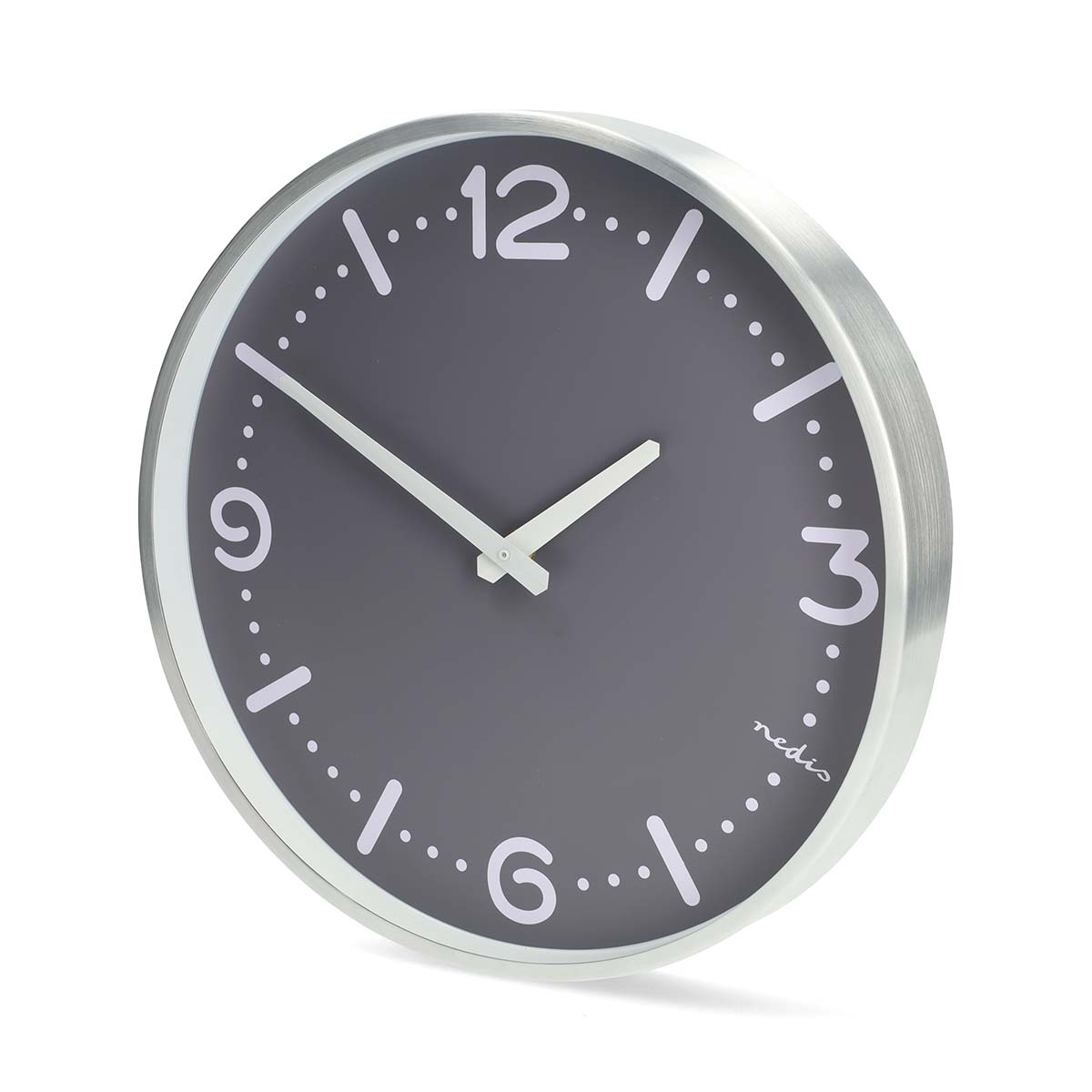 De grote witte cijfers steken duidelijk af tegen de grijze wijzerplaat en zijn van een afstand uitstekend leesbaar. Deze wandklok van duurzaam roestvrij staal met een eigentijdse afwerking past naadloos in moderne en professionele interieurs.