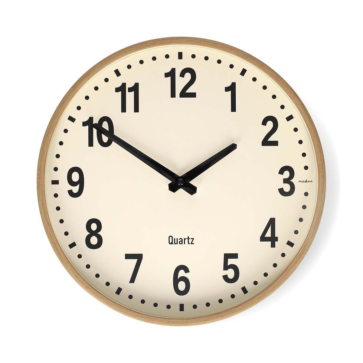De grote zwarte cijfers op een strakke witte wijzerplaat zorgen voor een goede zichtbaarheid en gemakkelijke leesbaarheid in een oogopslag. Het warme houten frame voegt een vleugje natuurlijke elegantie toe dat past bij zowel moderne als traditionele interieurs.
