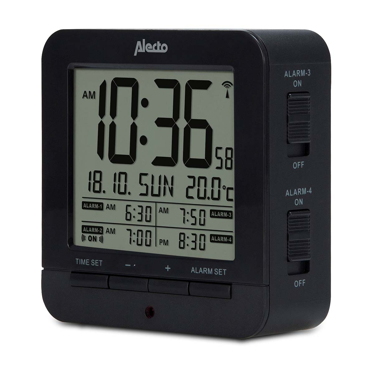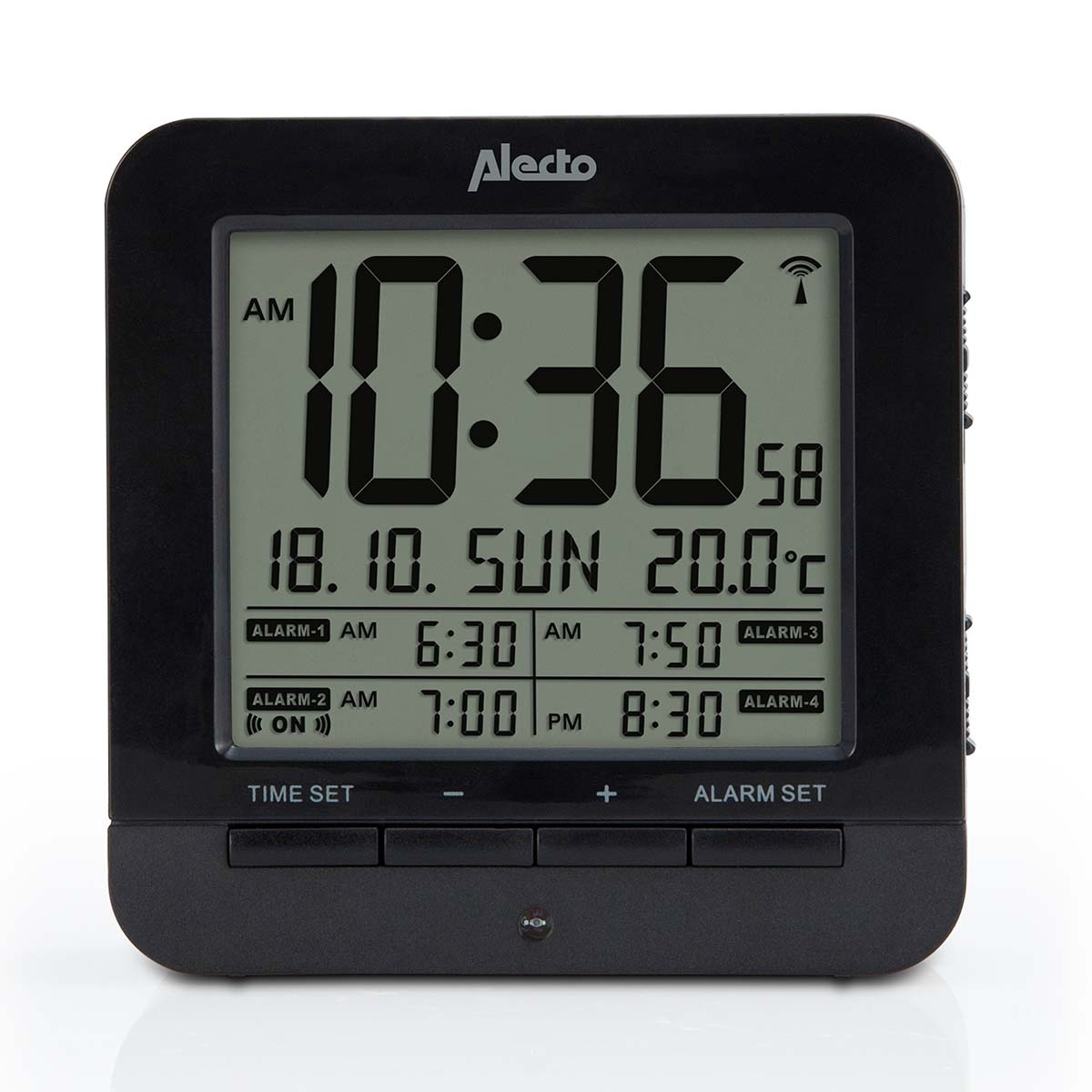Op het beeldscherm van deze wekker kun je veel informatie aflezen. Te beginnen met de tijd, aangegeven in uren, minuten en seconden: tot op de milliseconde nauwkeurig dankzij de DCF-gestuurde klok. Daaronder staan de datum, dag en temperatuur vermeld. En daaronder de wektijden die je hebt ingesteld. Op deze wekker met temperatuur kun je in totaal vier wektijden instellen. Erg handig voor jou en je partner, bij onregelmatige werktijden, in het weekend, etc.