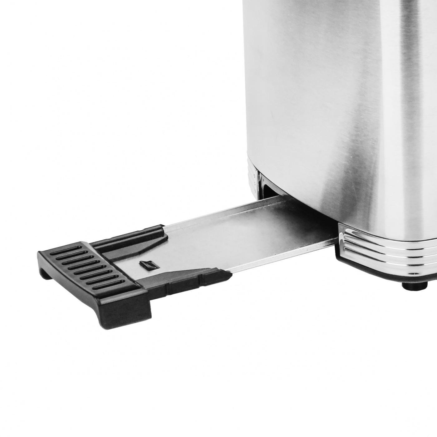Brödrosten är snyggt designad i rostfritt stål med svart front och har många extra finesser. Funktioner som autocentrering, upptining- och uppvärmningsfunktion gör denna brödrost till något alldeles extra. Dessutom har brödrosten en digital display, automatisk popup, stoppknapp och en utdragbar smulsamlare för enkel rengöring. De praktiska gummifötterna på undersidan stabiliserar brödrostens placering. Hållaren för bullvärmare gör att du smidigt kan tina och värma ditt bröd.