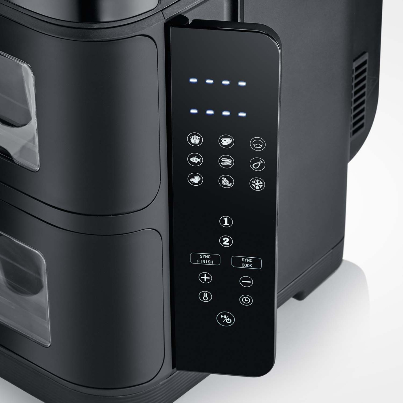 Med funktionen Sync Cook kan du enkelt kopiera inställningarna från en korg till den andra. Detta är perfekt för familjemåltider eller när du har gäster. Du kan laga allt från krispiga chips till saftiga kycklingvingar, biffar, grönsaker och mycket mer – allt på en gång! Dessutom ser Sync Finish till att båda korgarna blir klara med 30 sekunders mellanrum, vilket ger dig tid att servera maten varm och färsk.