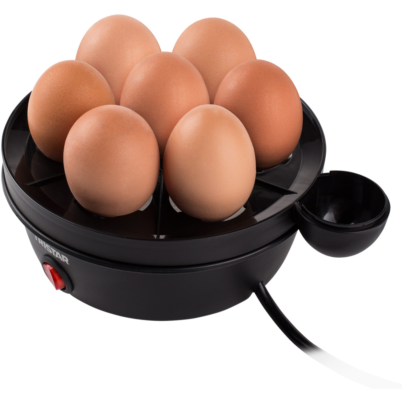 Designad äggkokare i rostfritt stål för 7 ägg per gång. Äggkokaren har ett äggfack och ett måttglas med en inbyggd äggstans.