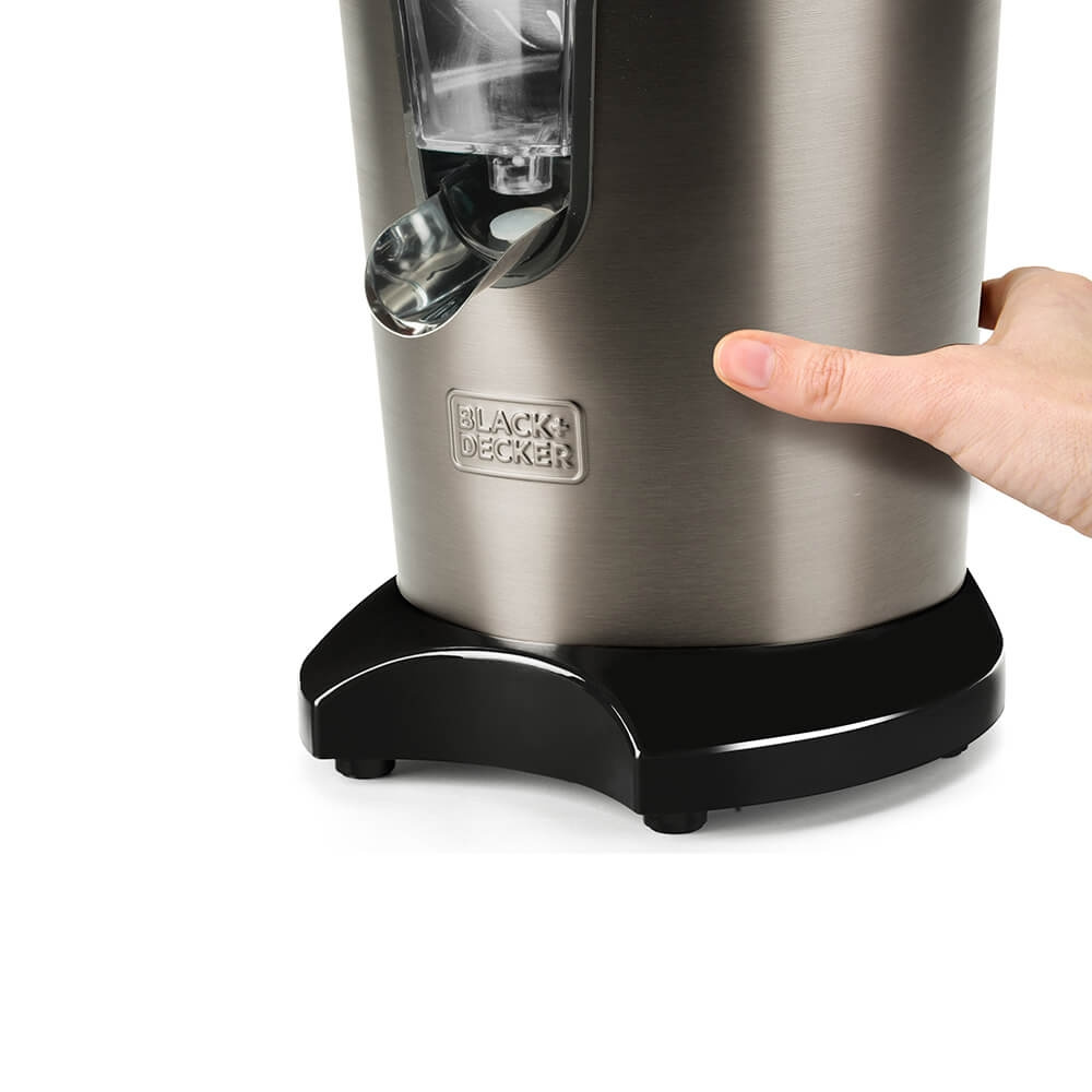 How to squeeze the juice from all of your favourite citrus fruits quickly, cleanly and easily with the electric lever juicer from Black + Decker. Its professional motor with 350W power offers a fast and precise extraction of the juice from any citrus fruit. It is very easy to wash since all of its components are detachable and dishwasher safe.