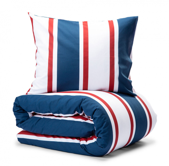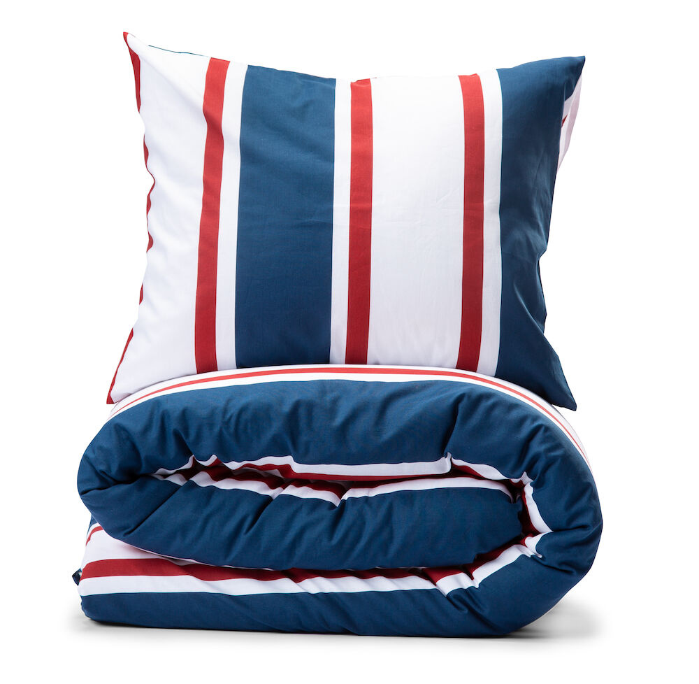 Ett skönt bäddset i slätvävd bomull med klassiska maritima ränder för den som drömmer om att vaggas till sömns till ljudet av kluckande vågor.