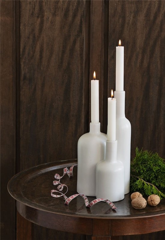 Denna charmiga ljusstake i porslin är formad som tre flaskor som sitter ihop. Den ger ett fint ljussken då ljusen hamnar i olika höjd. Passar fint i många olika miljöer.