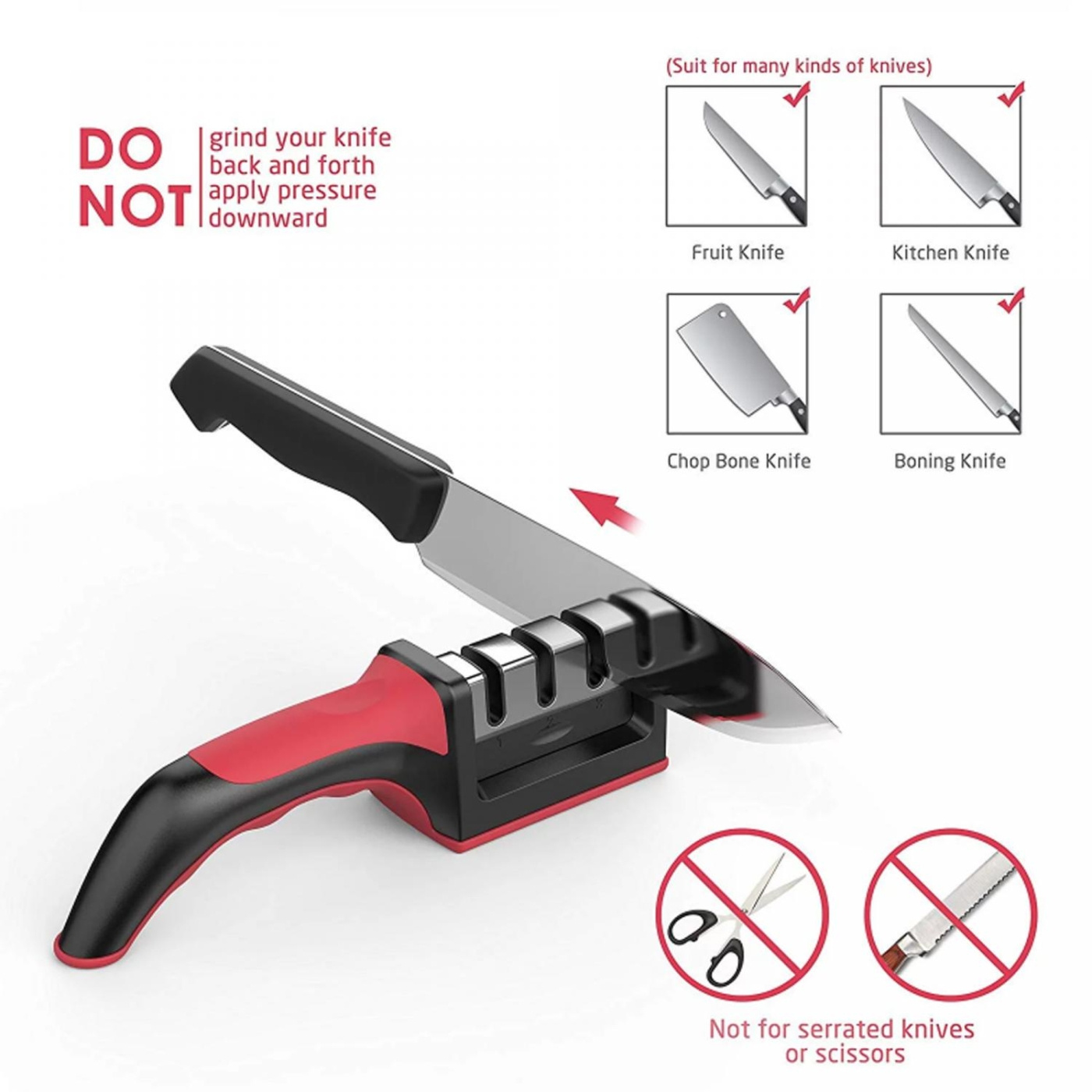 Herzberg Deze HG-8101 messenslijper is ergonomisch ontworpen om zowel veilig als effectief het snijvlak in je keuken te herstellen. In de slijper zitten drie stappen: keramische steen, diamantstaven en wolfraamcarbide staal.
