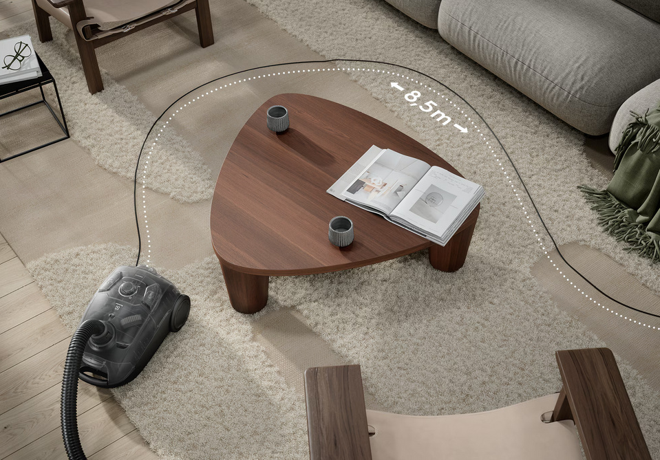 Deze ergonomische stofzuiger stelt u in staat om tot 72 vierkante meter schoon te maken zonder van stopcontact te wisselen. Dankzij het telescopische buis, grote wielen en 8,5 meter bereik kunt u soepel bewegen en schoonmaken zonder onderbreking.