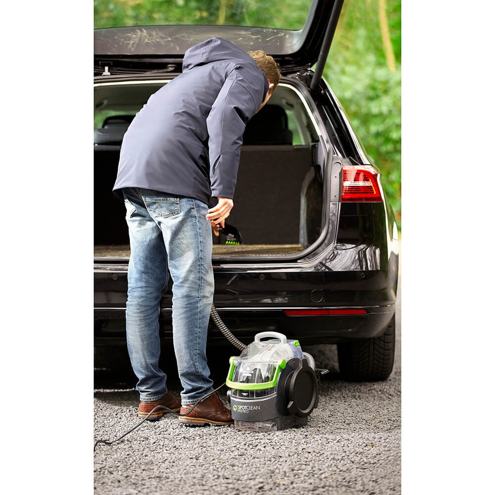 BISSELL SpotClean Pet Pro helps remove stains from almost any carpeted surface you find using water, BISSELL solution and hand-held cleaning tools with powerful suction. From areas with a lot of traffic and stairs to upholstery, car interiors and more. Stain Trapper Tool sprays, scrubs and sucks up extra coarse spills.