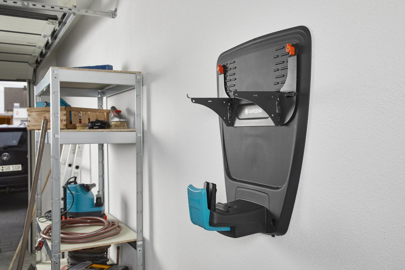 Het GARDENA wandrek is ontworpen voor ruimtebesparende winteropslag van de robotmaaier in een droge en vorstvrije ruimte, zoals een berging of garage. Naast de robotmaaier bevat het stevige metalen rek ook een laadstation.