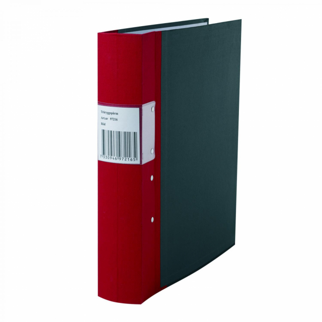 Omslag av papp med laminerad, smutsavvisande yta samt trärygg klädd i tyg.