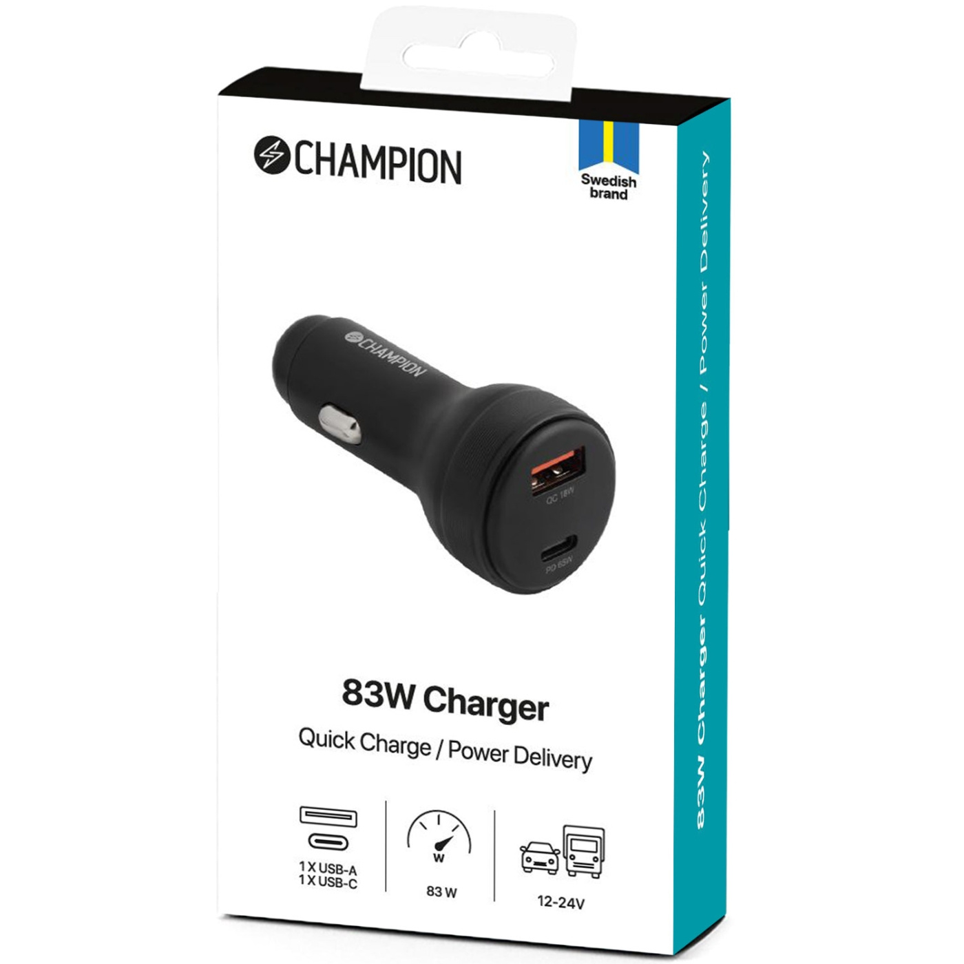 Håll dina enheter fulladdade på vägen med Champions kraftfulla billaddare. Med 83W uteffekt, ett USB-C och ett USB-A-uttag kan du enkelt ladda två enheter samtidigt – från smartphones och surfplattor till mer krävande prylar som laptops.