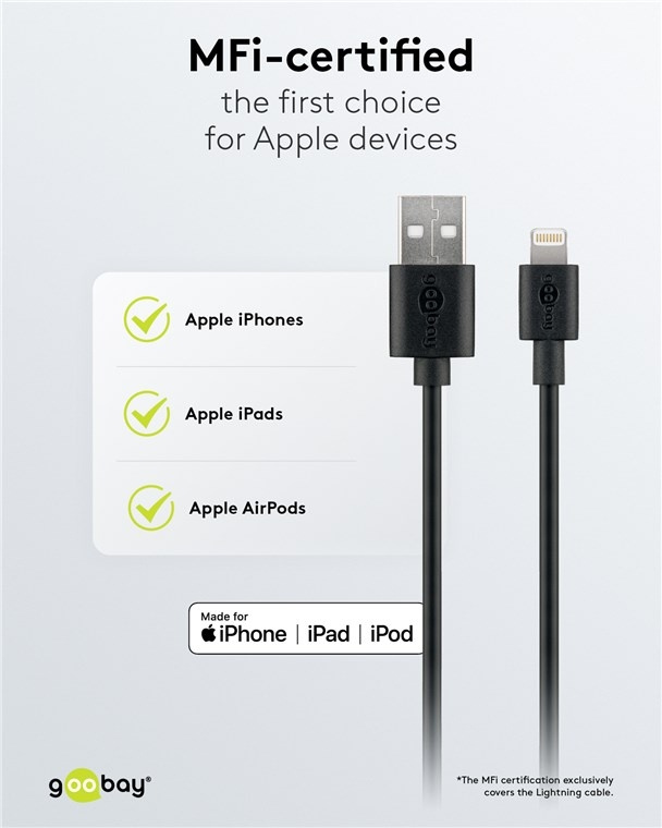 - De Goobay USB oplaadset bestaat uit 1x oplader en 1,0 m Apple Lightning kabel.