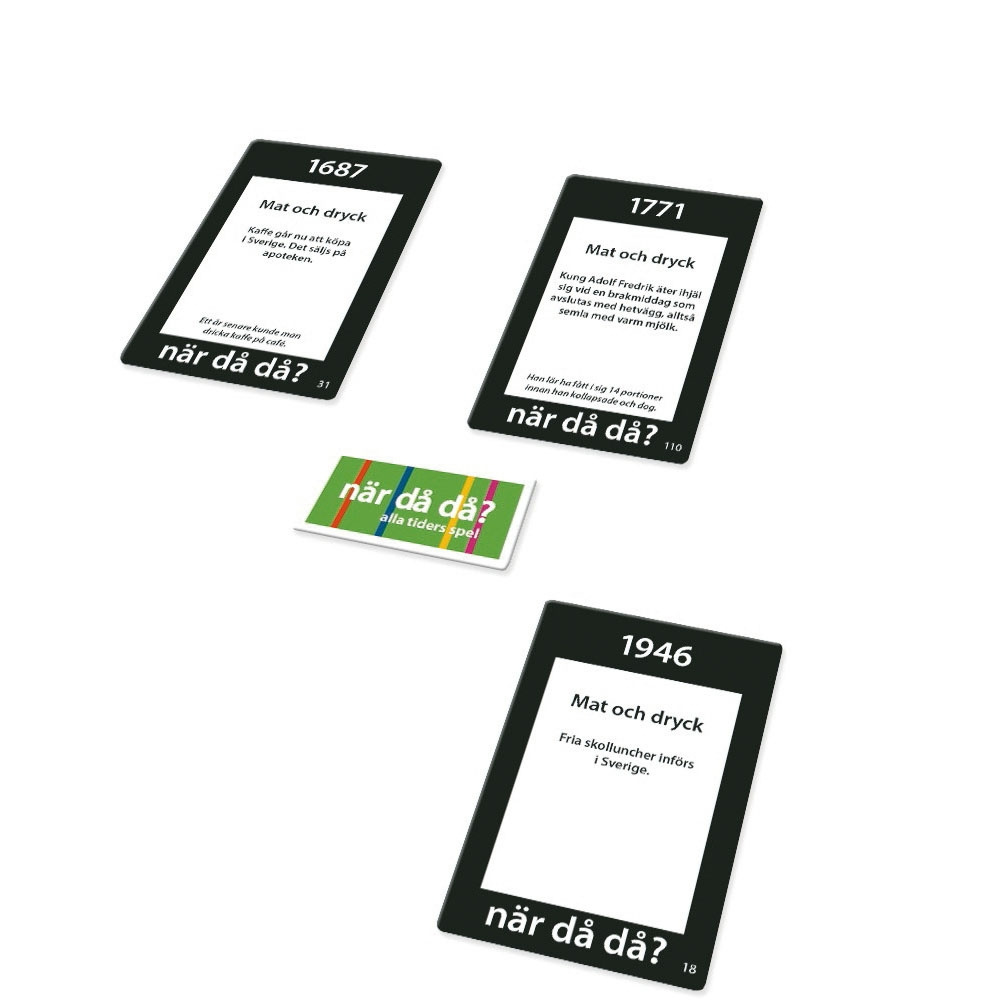 Utmana ditt minne och dina historiska kunskaper med det här spelet i fickformat. Spelarna turas om att dra kort och skapa en tidslinje med fem olika händelser från tidernas begynnelse till idag. Målet är att placera korten i rätt kronologisk ordning utan att behöva veta de exakta årtalen. Du kan välja att ta risker genom att försöka vinna flera kort på en gång, eller ta det säkra före det osäkra och vinna ett kort i taget. Den första spelaren som placerar fem kort korrekt vinner spelet. Spelet är utformat för 2 eller fler spelare och passar från 12 år och uppåt, vilket gör det till en rolig och lärorik aktivitet för familj och vänner.