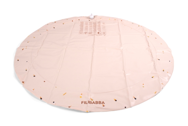 De plonsmat wordt bevestigd aan de tuinslang. Zo worden de zachte zijkanten van de mat continu gevuld met water en werken ze als een sproeier. Het midden van de mat is gevuld met een paar centimeter water, wat heerlijk is om in te spetteren.