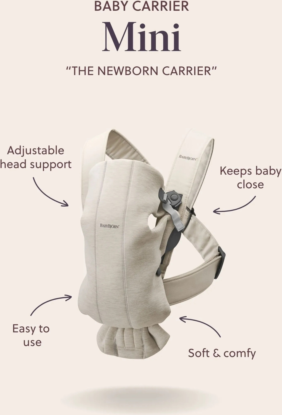 BabyBjörn Mini is een kleine, gebruiksvriendelijke en zeer zachte draagzak voor pasgeborenen. De draagzak is gemakkelijk aan te trekken zonder hulp en het hele voorpaneel is gemakkelijk te openen wanneer je een slapende baby optilt. De zachte, rekbare en zorgvuldig ontworpen stoffen maken de draagdoek een comfortabele en knusse plek voor je pasgeborene. Je baby reist in de draagdoek in een ergonomisch comfortabele kikkerhouding. De baby kan aan de voorkant van de draagdoek gedragen worden. Het gezichtje van de baby moet altijd naar de drager gericht zijn totdat hij of zij geleerd heeft om het hoofdje zelf te dragen. Gezicht naar voren kan gebruikt worden voor baby's ouder dan ongeveer 5 maanden.