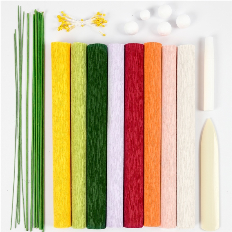 Innehåller: 8 rullar kräppapper i mixade färger, falsben i plast, pappersbelagd wire i två storlekar, frigolitkulor i två storlekar, ståndare i orange och Multi Glue.