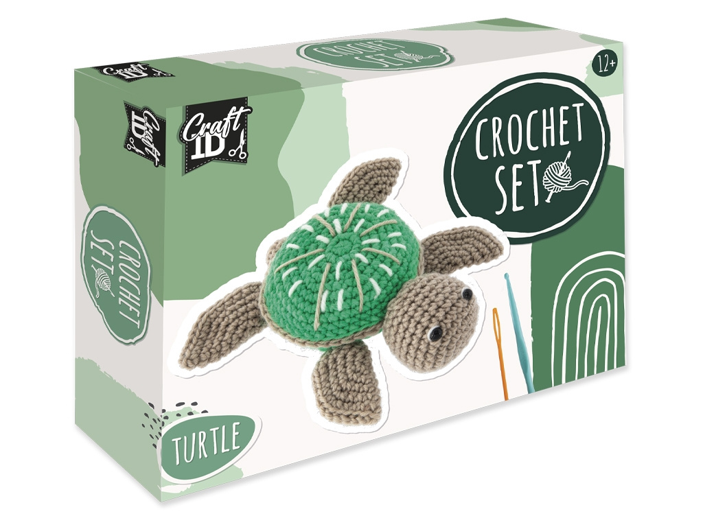 Haakpakket, schildpad. Dit pakket bevat alles wat je nodig hebt om een schildpad te haken. Het pakket bevat garen in verschillende kleuren, haaknaald, vulling, ogen en een naald
