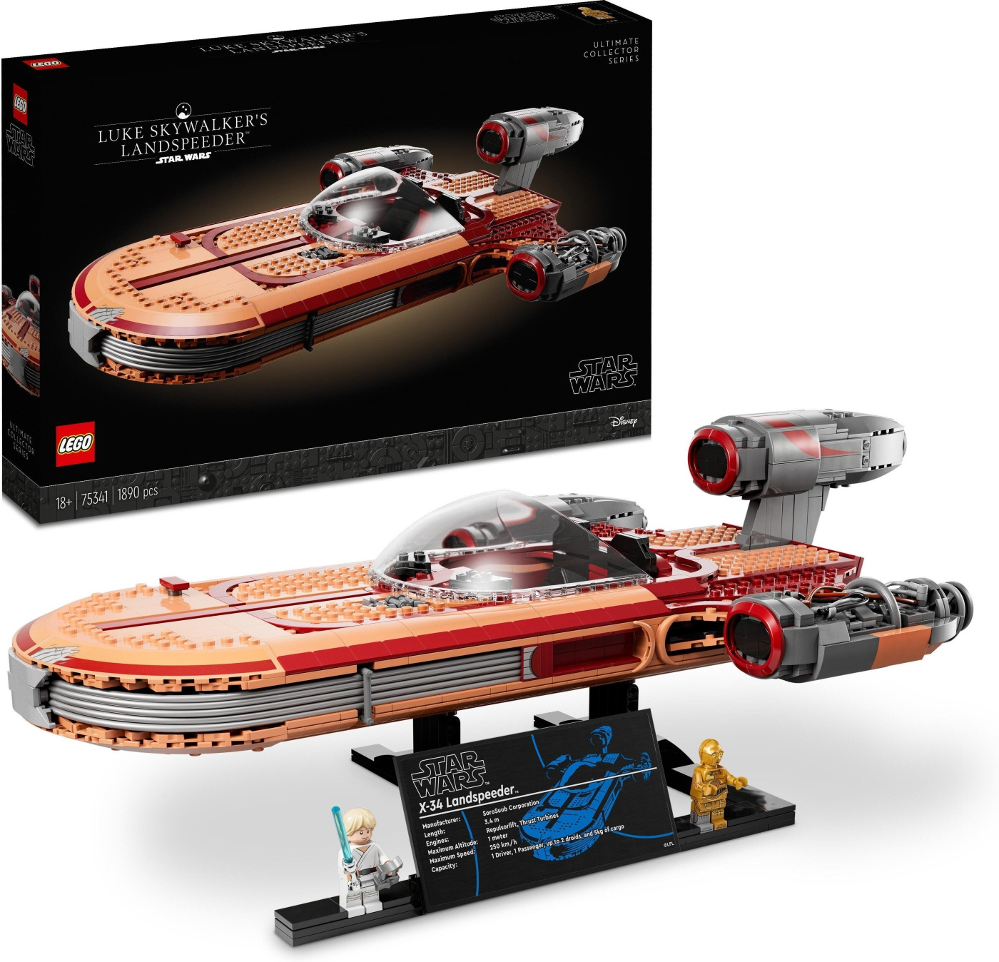 The buildable vehicle measures over 19 in. (49 cm) long and comes with a display stand for the hover effect. It is complemented by a plaque showing X-34 Landspeeder technical data, and 2 LEGO minifigures: Luke Skywalker with a lightsaber and electrobinoculars, and C-3PO.