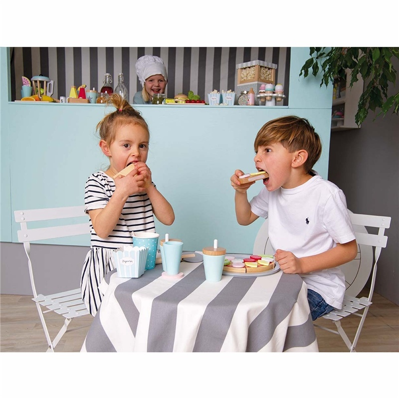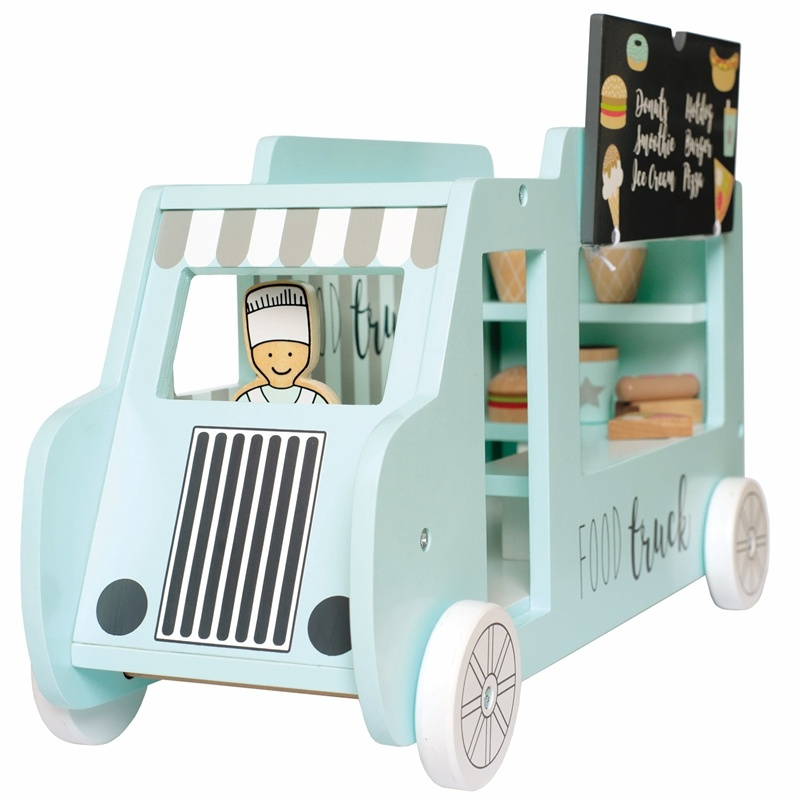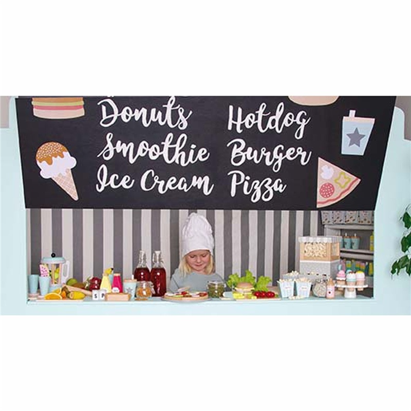 Vagnen har en meny som visar all god mat som erbjuds och även en lucka som kan stängas när det är dags att slå igen för dagen. Med denna meny blir du lätt populär bland dina vänner då det erbjuds både hamburgare, glass och pizza mm. Mat som barn älskar och känner igen! Självklart ingår även en kock som lagar maten och kör foodtrucken så det är bara för dig att ta beställningar och servera dina gäster. Kom och ät!