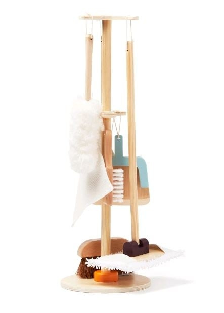 Een set met 6 verschillende schoonmaakgereedschappen. Maak kennis met een aantal essentiële levensvaardigheden: het schoonmaken van je huis! De set bestaat uit een houten dweil, bezem, borstel, stoffer en blik en een opbergstandaard. Een eigen schoonmaakset op kinderformaat kan verantwoordelijkheid bijbrengen, het zelfvertrouwen vergroten, de motoriek verbeteren en de oog-handcoördinatie ontwikkelen.