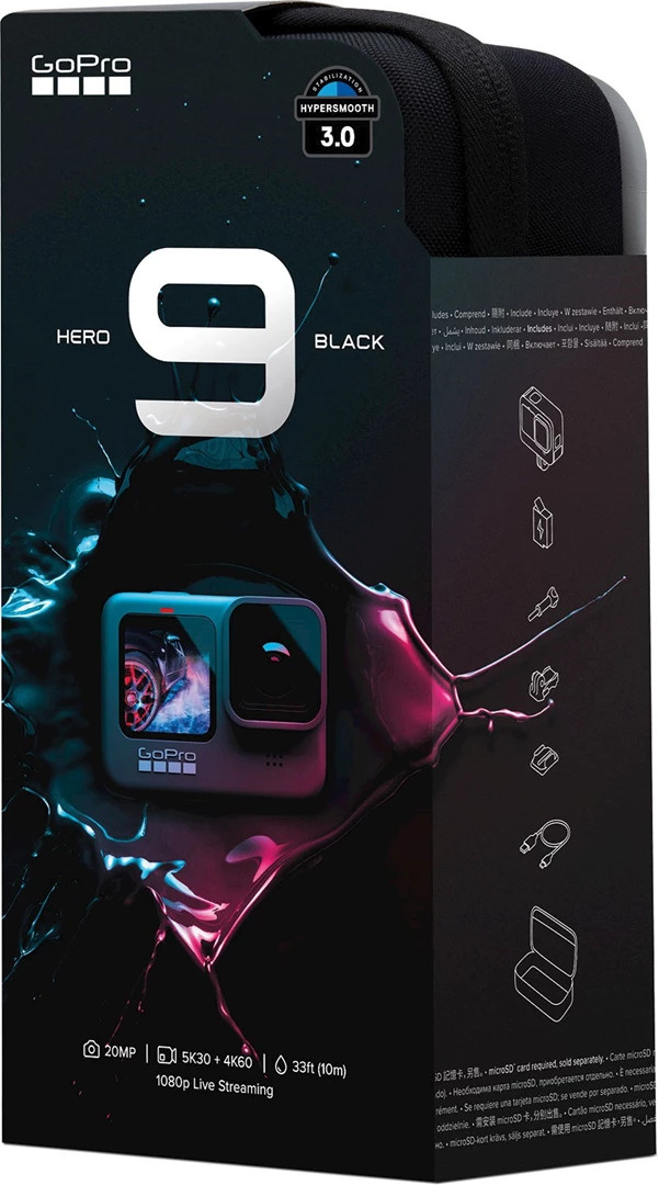 Så vad är nytt och vad skiljer GoPro Hero9 mot föregångaren Hero8? GoPro har gjort en hel del uppgraderingar där den klart mest avgörande och största uppgraderingen är färgdisplayen på framsidan av kameran som förenklar komponering vid selfiebilder och -videos. GoPro har även ökat på sensorn från 12 till 20 megapixlar och låter dig nu filma i hela 5K-upplösning. Batteriet har fått längre livstid och bildstabiliseringen tar ännu ett steg uppåt. Bland nya funktioner ser vi schemalagd inspelning, HindSight och Horisontutjämning. Se PDF under Tekniska specifikationer och läs mer om funktionerna nedan.