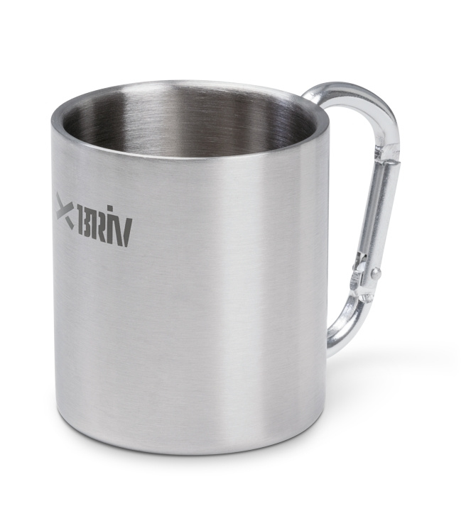 Mugg med praktisk karbinhake för upphängning på t.ex. ryggsäcken eller i bältet. Muggen och karbinhaken är tillverkad i slitstarkt stål. Rymmer 220 ml.