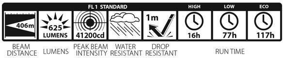 Prestaties volgens ANSI FL1-norm: 403 m lichtbereik, 625 lumen lichtstroom, 40 596 candela lichtsterkte. Brandduur op stand Full Power 32 uur, op stand Low Power 112 uur en op stand Eco 298 uur (waarbij 10% van de oorspronkelijke lichtintensiteit overblijft). In de praktijk brandt het armatuur dag en nacht ongeveer een paar weken onafgebroken met een bruikbare lichtbundel totdat de batterijen 0,99 V bereiken, waardoor het het meest energiezuinige armatuur van dit formaat op de markt is)! Spatwaterdicht IPX4. Stootvast tot 1 m.